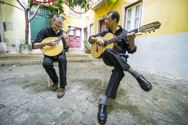 Two fado guitarists with acoustic and portuguese guitars in Alfama, Lisbon, Portugal